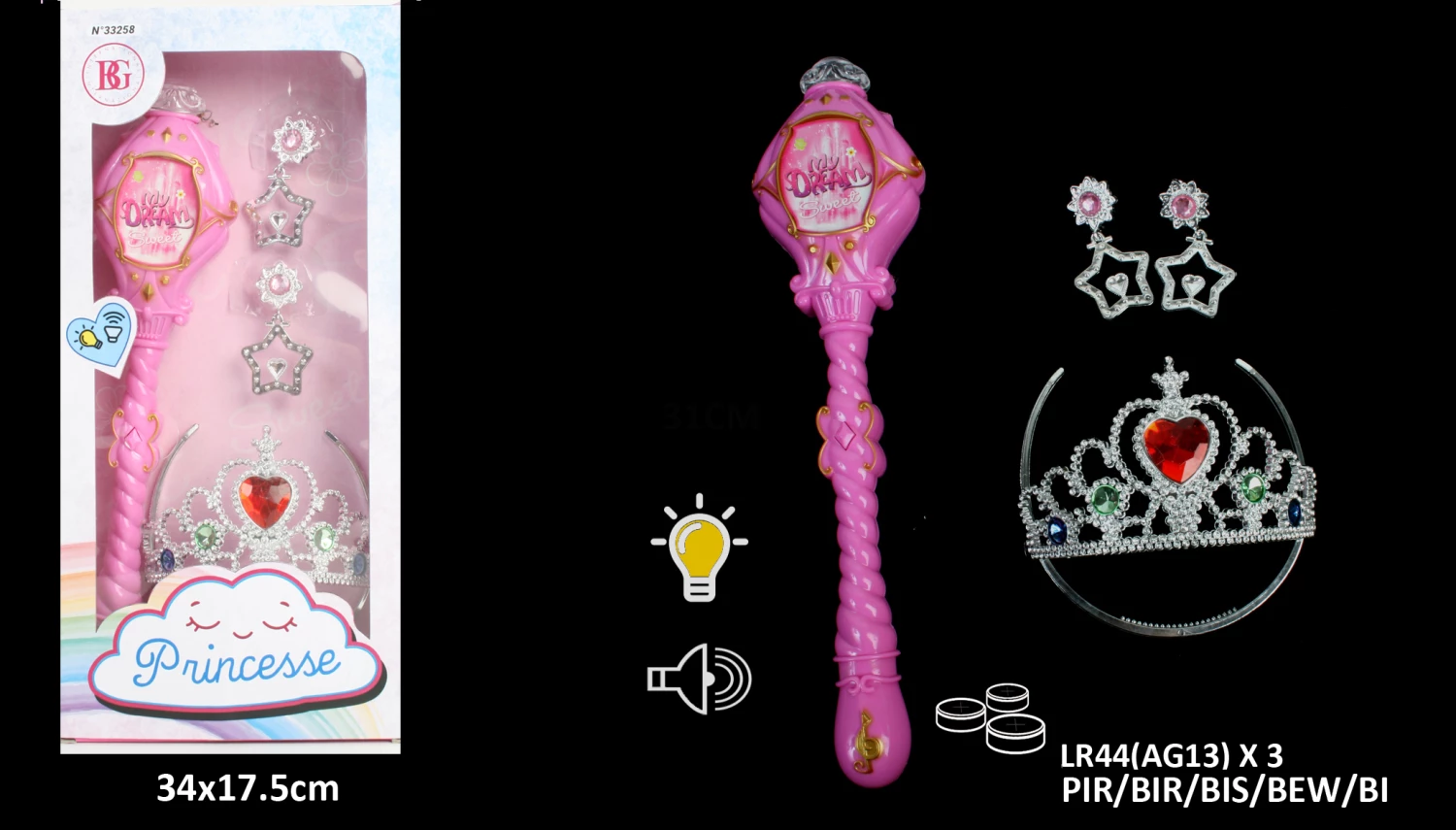 Une magnifique baguette de princesse lumineuse, sa taille est de de 34 x 17.5 cm (voir photo). C’est l’accessoire indispensable pour une petite fille, un très joli cadeau à l’occasion d’une kermesse lors d’un goûter d’anniversaire, un accessoire idéal pour accompagner un déguisement enfant de princesse ou de fée. Ce lot est vendu par 24 pièces, le prix indiqué est le prix unitaire.