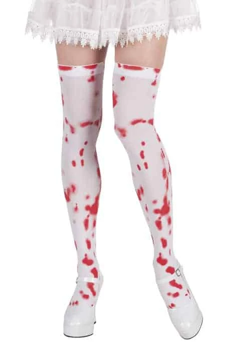 Bas blancs tachés de faux sang et autofixants, l’accessoire idéale pour être sexy et dans le thème d’Halloween, ou bien pour accompagner un déguisement assorti pour une soirée à thème. Taille unique, matière 100 % polyester, ce lot comprend 6 paires de bas, le prix indiqué est le prix unitaire.