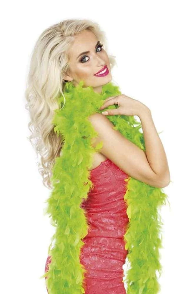 Boa couleur vert anis en plumes, il pèse 50 grammes et mesure 1.80 mètres, très pratique pour accompagner un déguisement chic ou sexy, ou bien pour une soirée cabaret du type années folles. Les boas sont vendus par 5 minimum, le prix indiqué est le prix unitaire.