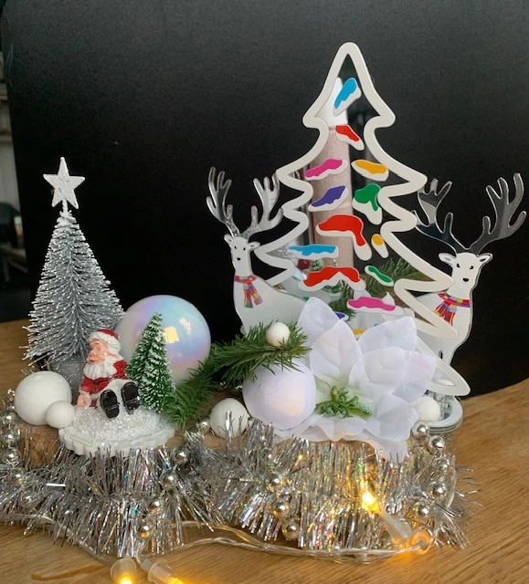 Un centre de table de 20 cm représentant un duo de rennes de noël et un sapin multi couleurs avec un effet miroir (voir photo). Une idée de décoration de noël sympa et originale pour la décoration d’hiver d’un magasin ou d’un quartier pour les fêtes de noël. Joyeux noel et Bonne année. Retrouvez nos idées de cadeaux pour réussir une soirée d’arbre de noël.
