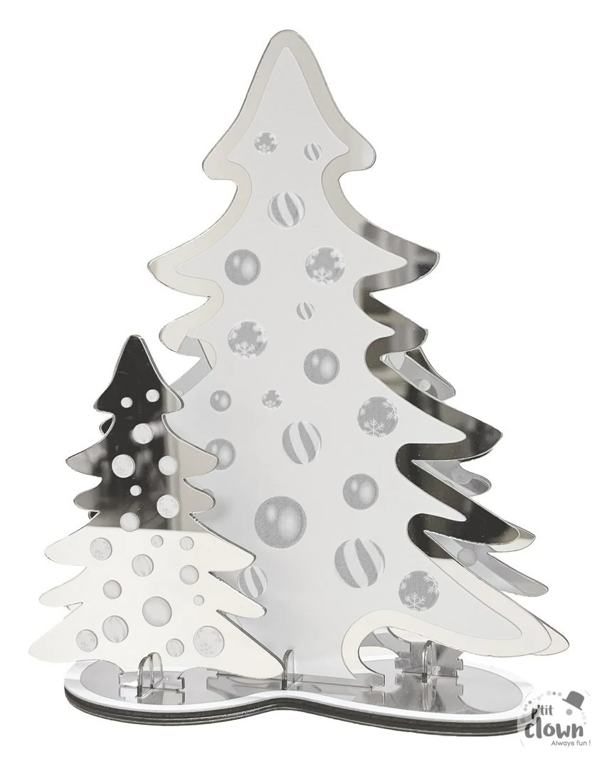 Un centre de table de 20 cm représentant des sapins de noël en noir et blanc avec un effet miroir (voir photo). Une idée de décoration de noël sympa et originale pour la décoration d’hiver d’un magasin ou d’un quartier pour les fêtes de noël. Joyeux noel et Bonne année. Retrouvez nos idées de cadeaux pour réussir une soirée d’arbre de noël.