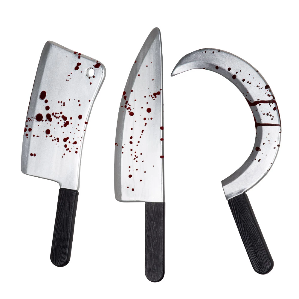 Un couteau avec du faux sang de la période médiévale, hachoir, serpe, couteau de chez Boland (voir photo). Vous avez le choix des armes pour faire trembler les convives pour Halloween ou une soirée sur le thème de l’horreur. Incarner un tueur en série vous tente ? 3 modèles différents sont proposés, pas de choix pour la vente à l’unité. Retrouvez l’ensemble des armes factices proposées sur le site ainsi que nos outils et armes pour Halloween.