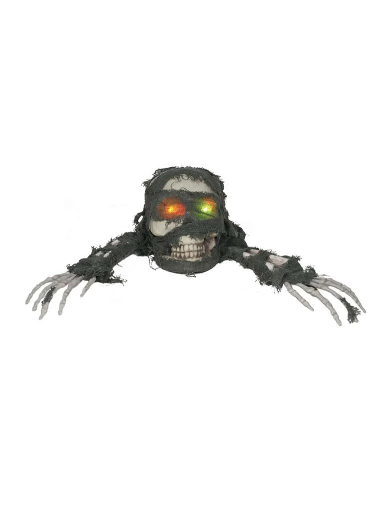 Un crane de squelette aux yeux lumineux avec deux mains, la taille de l’ensemble est de 27 x 35 x 14 cm (voir photo). C’est l’accessoire idéal pour la décoration d’une salle sur le thème de l’horreur ou à l’occasion d’Halloween ou pendant une soirée déguisée. Découvrez toutes nos décorations animées pour Halloween en cliquant ici.