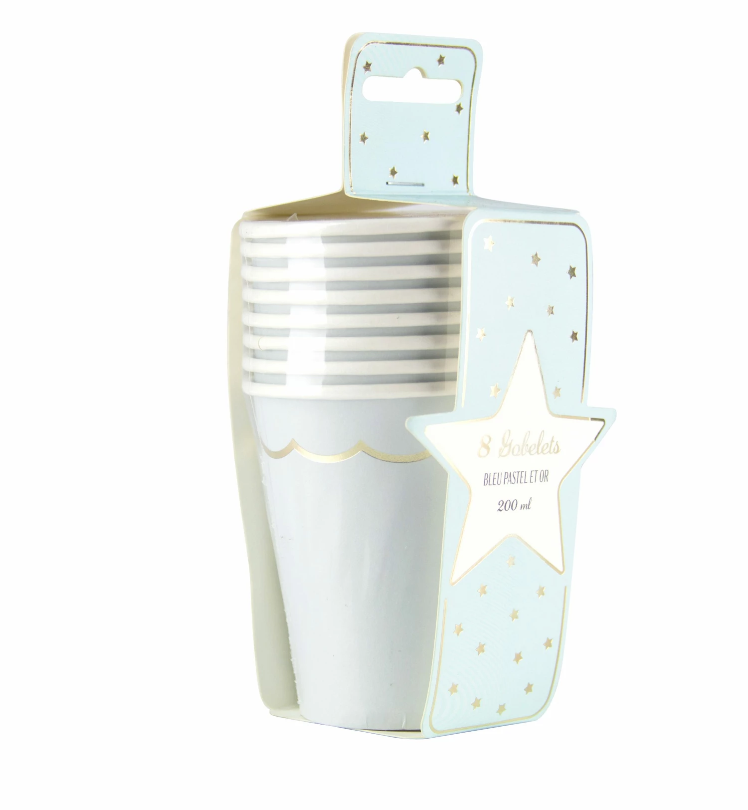 Un set de 8 gobelets jetables bleu pastel et or pour une décoration de table dans une baby shower à l’occasion d’une naissance.. Ces gobelets de 20 cl sont vendus par pack de 8 gobelets. Découvrez toutes nos collections de vaisselle jetable.