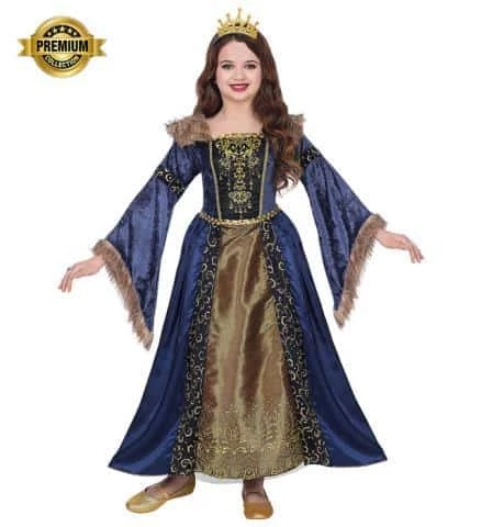 Un déguisement historique pour incarner une magnifique reine du moyen age (voir photo). Un costume enfant pour jeune fille comprenant une robe longue avec un jupon en crinoline et une couronne. Ce déguisement Widmann sera parfait pour une fête médiévale ou lors d’une soirée déguisée sur le thème médiéval ou du moyen age.