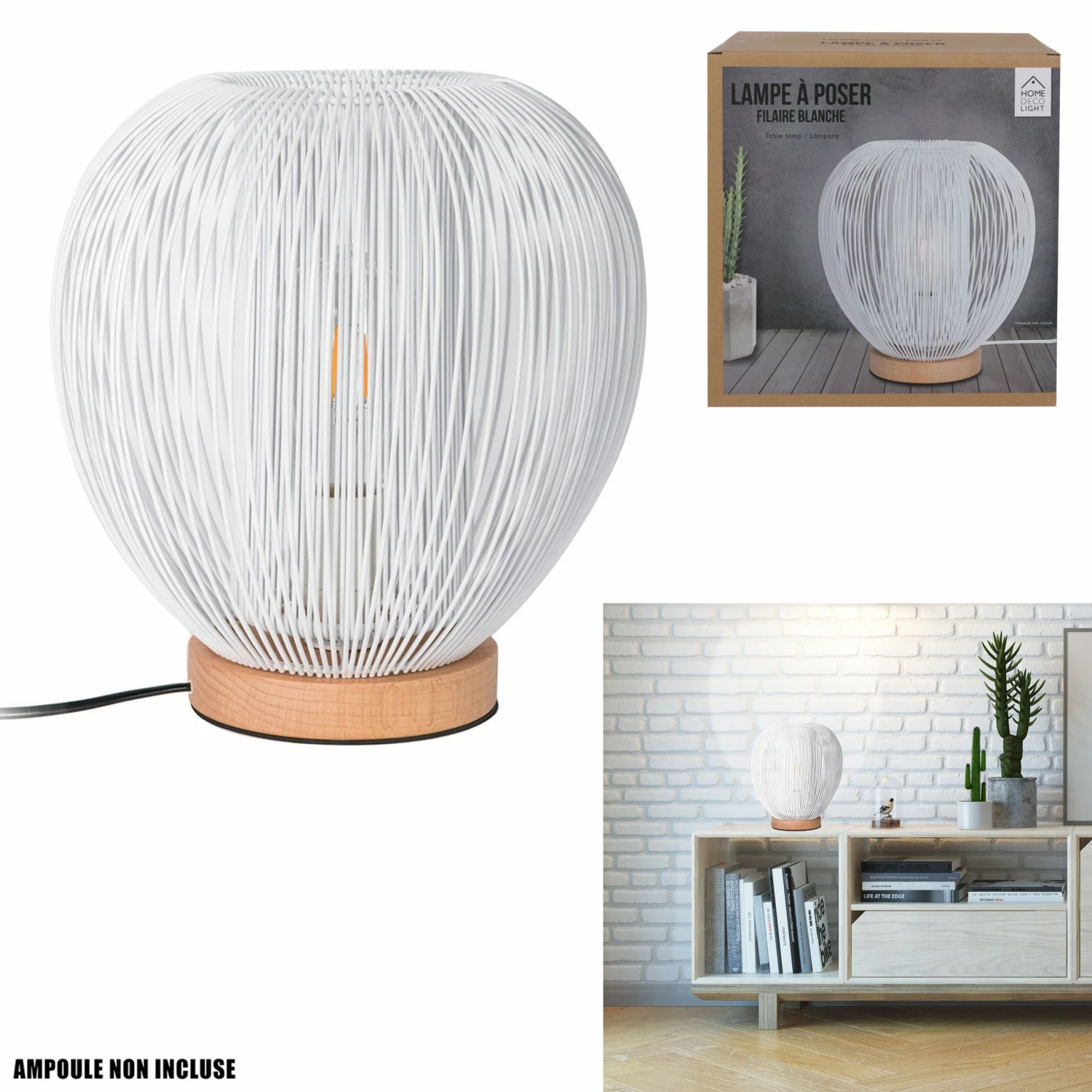 Une superbe lampe en forme de boule filaire de couleur blanche, impeccable pour poser sur un meuble dans un salon, une chambre ou la pièce de votre choix. Cette lampe est vendue sans l’ampoule.