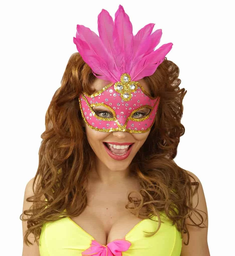 Très joli loup brésilien avec son masque rose et doré et ses grandes plumes plumes assorties. C’est l’accessoire idéal pour le carnaval ou pour une soirée déguisée. Vous allez pouvoir danser la samba toute la nuit et épater les convives, en route pour le Brésil et le carnaval de Rio. Avec ce masque brésilien aux couleurs néon de la marque Widmann, vous allez pouvoir monter sur scène ou sur un podium pour un spectacle de danse ou pour la fête nationale brésilienne. Ce lot est vendu 6 pièces minimum, le prix indiqué est le prix unitaire.