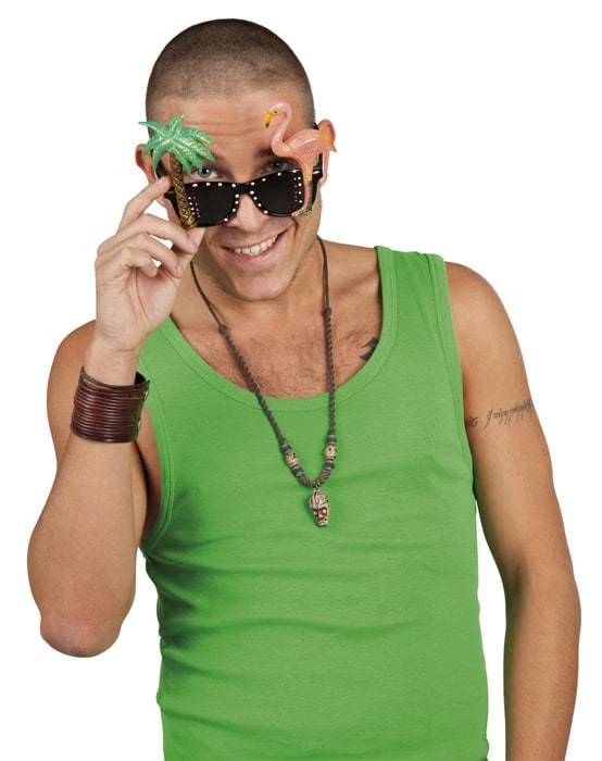 Paire de lunettes mixte et humoristique, lunettes noires et design avec un flamant rose d’un coté et un palmier de l’autre, la plage, les îles, les vacances, ambiance détendue et humour. Les lunettes drôles, un accessoire idéal pour faire rire les convives d’une belle soirée déguisée d’été, le thème hawai ou vacances peu importe ! Retrouvez nos paires de lunettes animaux.