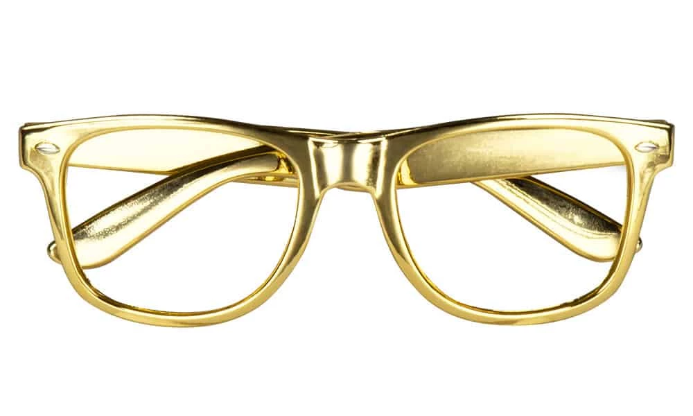 Une paire de lunettes sans verres avec un contour doré, un accessoire comique et économique pour accompagner votre déguisement lors d’une soirée à thème ou pour un anniversaire. Des lunettes drôles faciles à distribuer lors d’un enterrement de vie de jeune fille evjf ou de garçon evg, une soirée disco ou années 80. Ce lot est vendu par 3 paires minimum, le prix unitaire d’une paire de lunettes est de 0.94 euros HT.