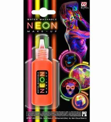 Fonds de teint pour le visage ou le corps en flacon 18 grammes, peinture fluo néon réagissant aux uv et lavable à l’eau.