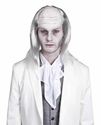Perruque de zombie de couleur blanche, avec un faux front qui donnera un effet dégarni à la Albert Einstein, le savant fou, cette perruque de mort vivant est idéale pour une soirée déguisée, mais aussi pour compléter votre déguisement lors de votre prochaine fête d’Halloween.