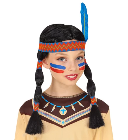 Une perruque pour un jeune fille indienne avec de longs cheveux noirs, des nattes, un bandeau et une plume. Une magnifique perruque enfant de la marque Widmann, parfaite pour compléter un déguisement de squaw lors des soirées sur le thème du western avec les cow-boys et les indiens ou bien dans une soirée déguisée, soyez apache jusqu’au bout de la nuit. Cette perruque est vendue par lot de 6 pièces minimum, le prix indiqué est le prix unitaire. Découvrez tous nos articles indiens pour enfants ou western pour enfants.