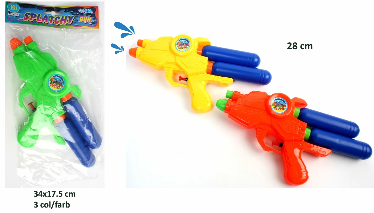 Ce pistolet à eau avec double réservoir mesure 28 cm, c’est l’arme idéale pour que les enfants s’amusent pendant des heures en plein air, c’est aussi un indispensable pour une kermesse. Ce pistolet est aussi un jouet pour les plus grands lors d’une fête en plein air.