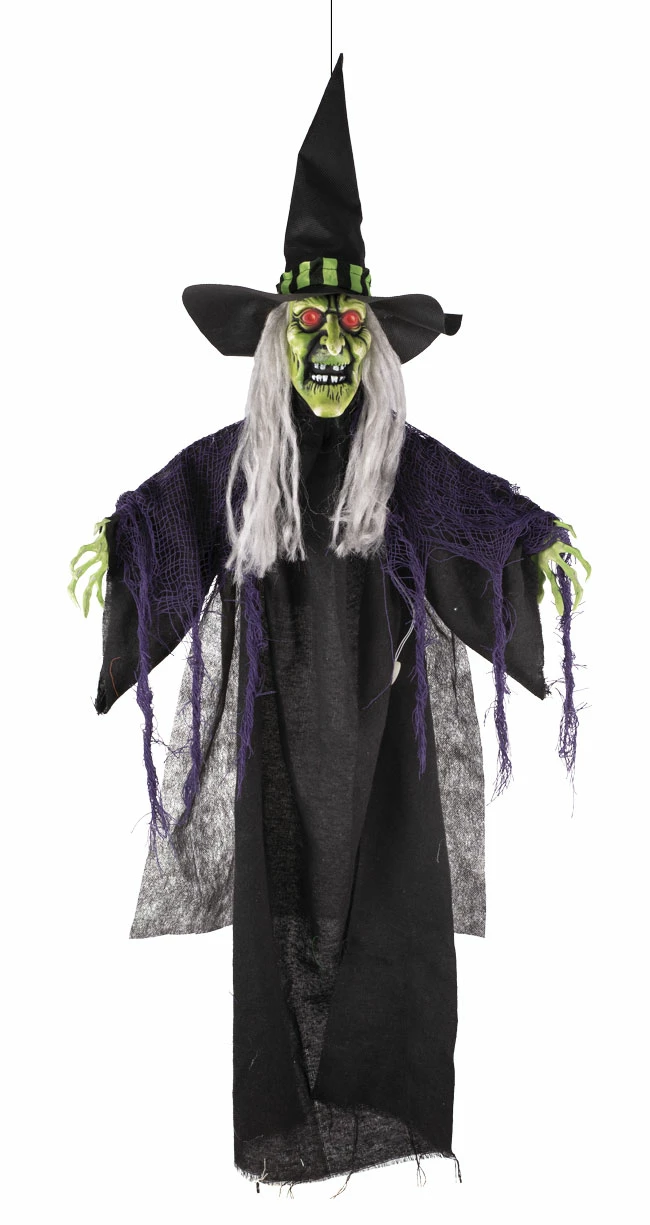 Une vieille sorcière à suspendre de 90 cm avec une animation sonore et lumineuse qui fonctionne avec des piles qui sont fournies (voir vidéo). C’est l’accessoire idéal pour la décoration d’une salle sur le thème de l’horreur ou à l’occasion d’Halloween ou pendant une soirée déguisée. Découvrez toutes nos décorations animées pour Halloween en cliquant ici.