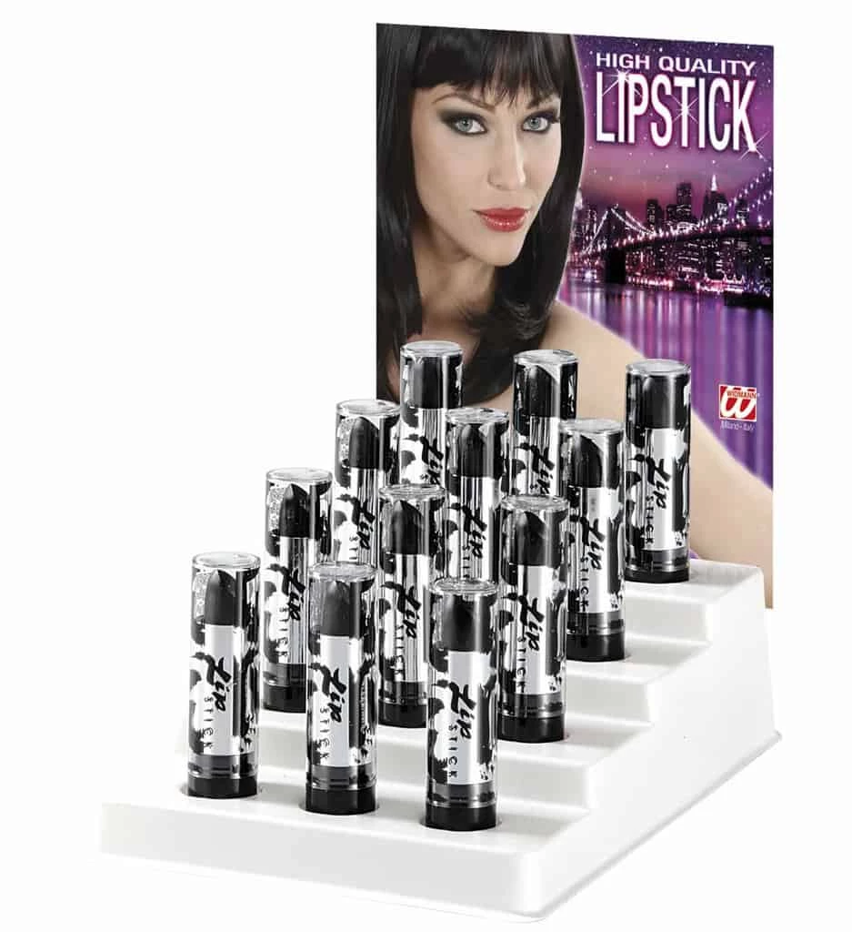 Un Stick de rouge à lèvres noir de très bonne qualité pour votre maquillage pour la grande soirée d’ Halloween ou dans votre prochaine soirée déguisée sur le thème gothique ou de l’horreur. Ce tube de vernis de marque Widmann est vendu uniquement par lot de 12 minimum, le prix indiqué est le prix unitaire.