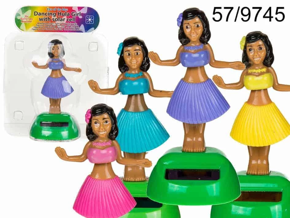 Une petite figurine solaire en forme de vahiné sous plusieurs modèles (voir photo), un grand classique très tendance, un petit panneau solaire permet à cette petite danseuse vahiné de danser dès qu’il y a un rayon de soleil ou de la lumière, plus besoin de piles, c’est magique et très dans l’air du temps ! C’est un accessoire idéal pour la décoration d’une soirée à thème sur hawaï ou bien comme cadeau pour une kermesse ou tombola.